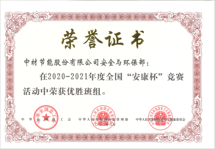近日,中華全國總工會、中華人民共和國應急管理部、國家衛生健康委員會聯合發文,表彰2020—2021年度“安康杯”競賽先進集體和優秀個人,中材節能股份有限公司(以下簡稱“中材節能”或“公司”)安全環保部榮獲2020-2021年度全國“安康杯”競賽優勝班組榮譽稱號。